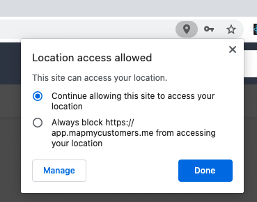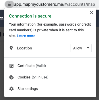 Your web browser will ask you to give Map My Customers permission to access your location. Granting location access to the Map My Customers web app is very important as it helps you do the following: