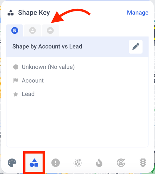 Note: If an data object is not turned on at the top of the map - you will not be able to click on the Shape Key for this object. Learn more about turning on different types of data here.