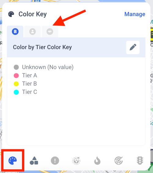 Note: If an data object is not turned on at the top of the map - you will not be able to click on the Color Key for this object. Learn more about turning on different types of data here.To learn more about creating Color Keys - please visit the Pin Settings and Color Key article here.